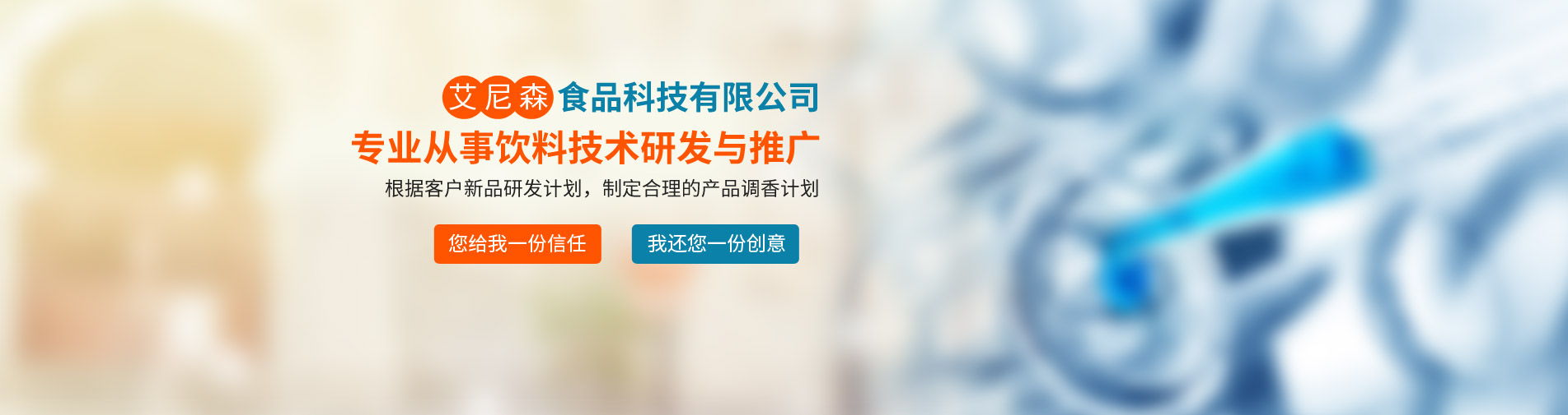 廊坊市艾尼森食品科技公司是一家專(zhuān)業(yè)從事飲料技術(shù)研發(fā)與推廣的公司,公司業(yè)務(wù)主要包括食品飲料技術(shù)咨詢與服務(wù)、產(chǎn)品定位與現(xiàn)有產(chǎn)品品質(zhì)改進(jìn)、新產(chǎn)品技術(shù)工藝研發(fā)等。公司坐落于京津冀核心地帶--廊坊市,位置得天獨(dú)厚,現(xiàn)與京津多家研究所形成戰(zhàn)略合作關(guān)系,為多家上市公司及知名企業(yè)提供技術(shù)支持與原材料供應(yīng)。